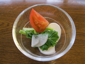 生のカブを塩もみして、トマトを添えたものです。